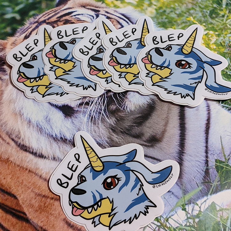 You've seen cats blep before, but what about dino dog monsters? This sticker features Gabumon being cute but maybe a little derpy with his tongue out in a blep!